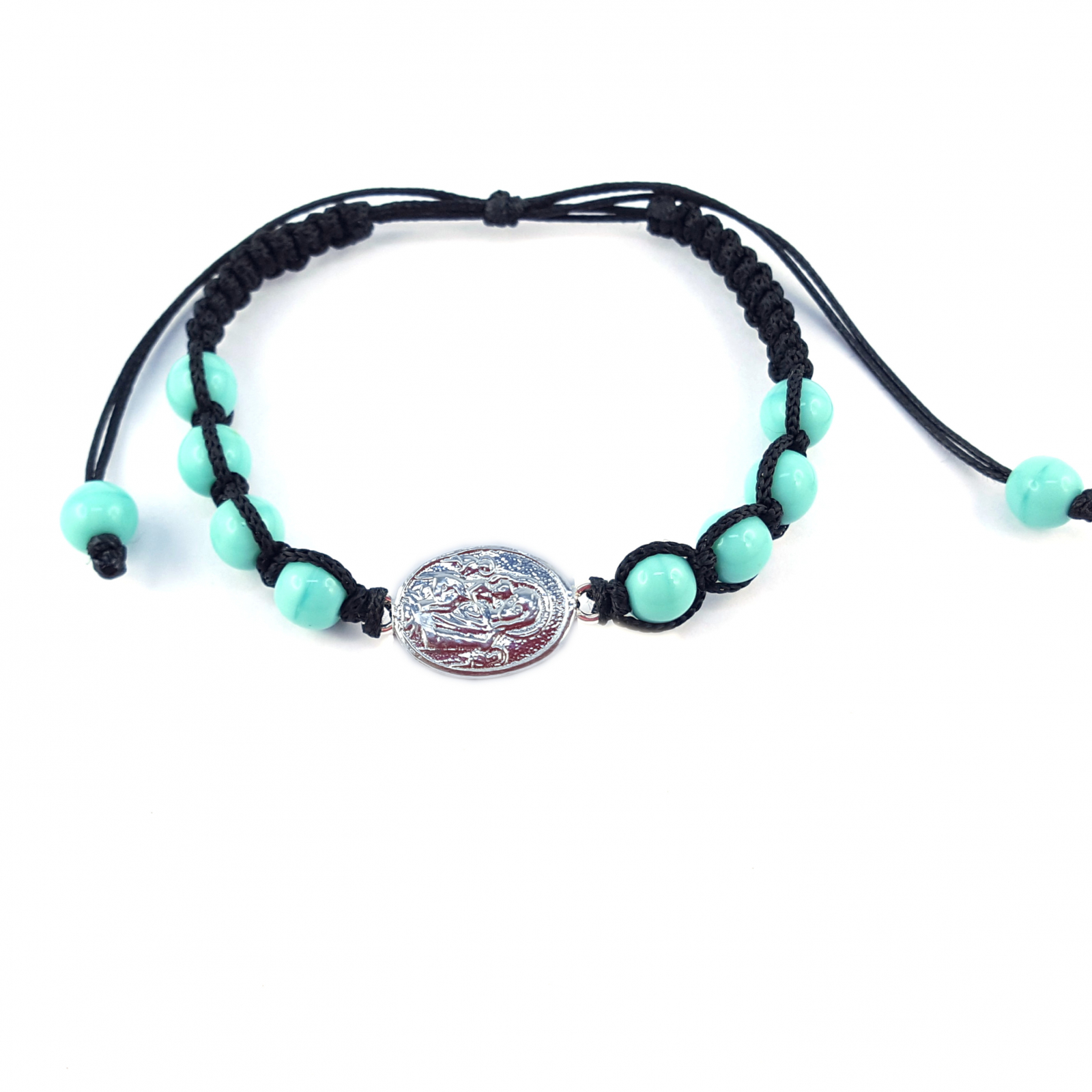 Bratara snur negru impletit manual personalizata medalion Maica Domnului pruncul Iisus argint margele turcoaz sticla Bohemia reglabila 4372150 Dras