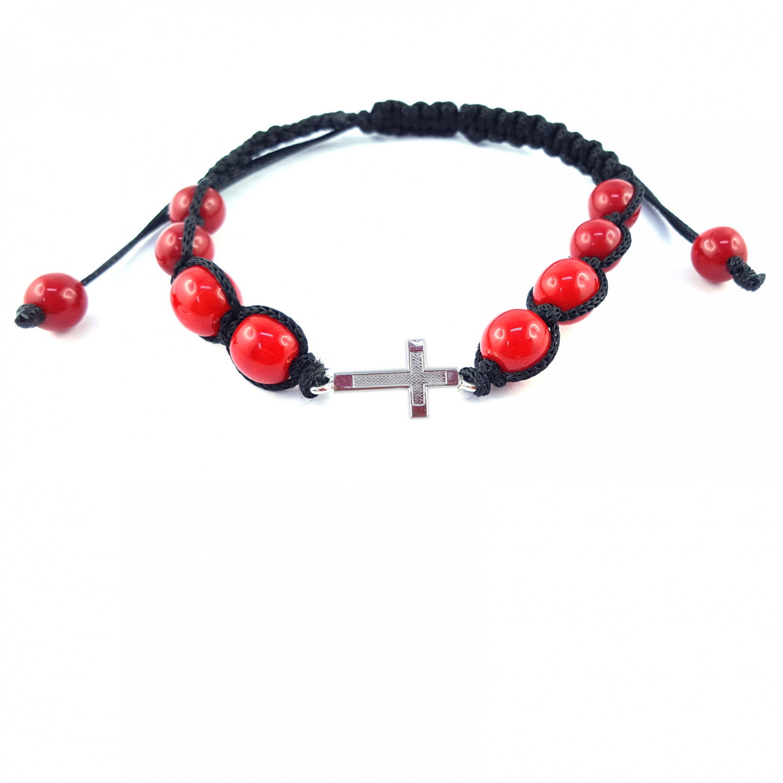 Bratara snur negru impletit manual personalizata cruciulita argint margele rosii sticla Bohemia reglabila 4108190 Dras
