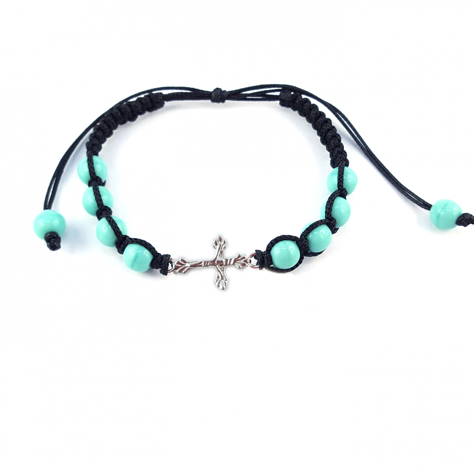 Bratara snur negru impletit manual personalizata cruciulita argint margele turcoaz sticla Bohemia reglabila 4221060 Dras